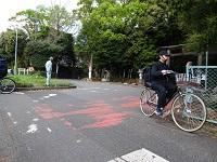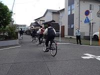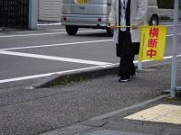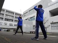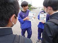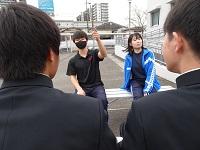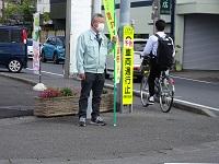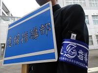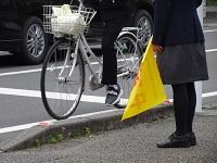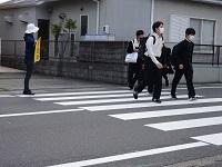職員が通学路に立ち、登校中の生徒たちに交通安全を呼びかけています。