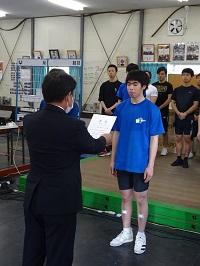 高体連ウエイトリフティング専門部長として、賞状を授与させていただきました。