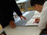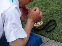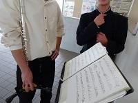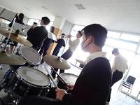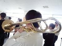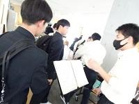 演奏会終了後、関心を持った新入生たちに楽器体験を勧めていました。