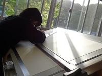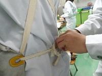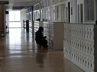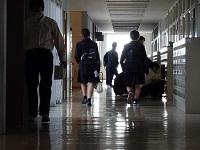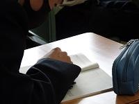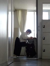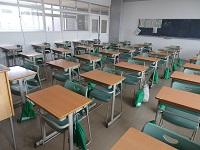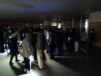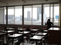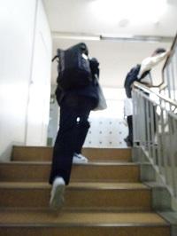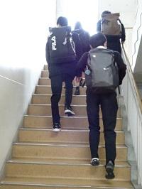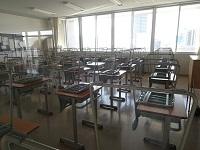 地震の揺れが収まるまで机の下に身を隠しました。その後、停電した暗い校舎内を、1階の生徒昇降所まで階段を使って避難しました。