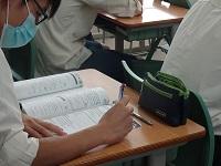 今日は献血車が来て献血を行います。受付カードに記入をしていました。