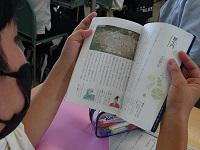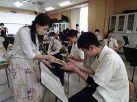 持参していただいた水口さんの切り絵作品を見て驚く生徒たち。