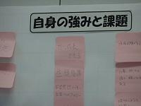定期テストまでを振り返って、2種類の附箋を使い、ピンク色には「強み」を、水色には「課題」を各々記入しました。その後、模造紙に貼り、順番に自分の書いた内容を発表しあい、シェアしました。この二か月、どのような思いで生徒たちや学校と向き合ってきたかを認識することができました。また、同じような悩みを感じていることを知り、互いに励ましあっていました。参加者の前向きな姿勢がみられ、有意義な研修となったようです。