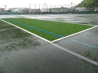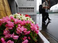 風が強く雨で濡れながらも、元気良く登校してくる生徒たち。
