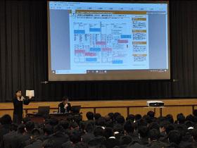 9月6日(金)のLHRの時間に、工業科の1年生を対象に2年次の選択科目説明会が行われました。まず体育館で全体集会が行われた後、各教室に戻って、各科の先生から専門科目の説明がありました。
