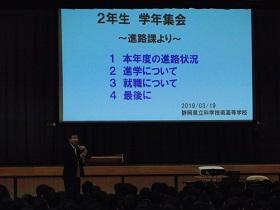最後に学年主任の先生から、3年生への準備が始まっている、試験情報や志望する大学の情報収集、試験のスケジュール管理等の活動は人任せでなく自分で行うこと。さらに確実を期すために保護者や担任の先生への報連相を行いながら進めていくように。とのお話がありました。