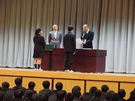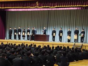 表彰式では、夏季休暇中に行われた各種大会で優秀な成績を収めた6団体10名の生徒が表彰されました。表彰内容は以下のとおりです。