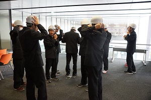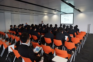 (熱心にレクチャーを聴く生徒たち) (案内していただいた企業担当者の方と)