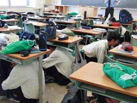 今回の防災訓練は、生徒が地区ごとに教室に集まり、①地区ごと生徒同士の防災意識を高める、②各地区担当の先生の確認、③生徒下校集団の編成確認、を目的に行われ、地震注意情報発令時の帰宅方法の確認や、帰宅時の危険箇所等について話し合いが行われました。