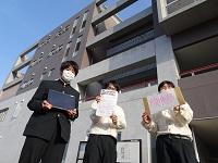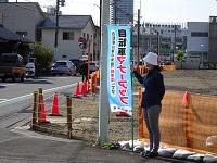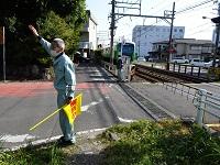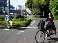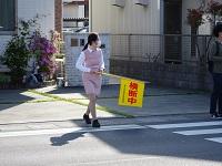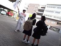 職員が学校周辺の通学路に立ち、あいさつを交わしながら交通安全を呼びかけています。