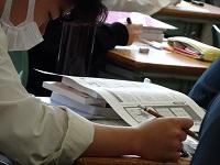 1年生が、図書室の使い方の説明を受けた後、図書の貸し出し手続きを行っていました。