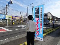 交通安全委員が街頭に立ち、交通安全を呼びかけています。