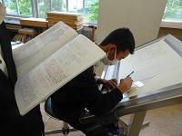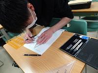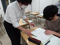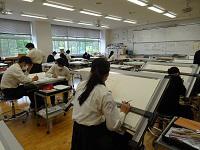 製図室では、先生から製図の助言を受けている生徒がいました。