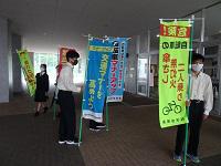 交通安全委員が街頭に立ち、交通安全を呼びかけました。