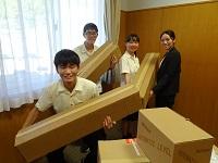 総務部長の永田様と、入社2年目の柴田さん(本校都市基盤工学卒業生)が届けてくださいました。