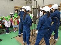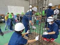 建築デザイン科の生徒たちが鉄筋の組立てをしているところを見学