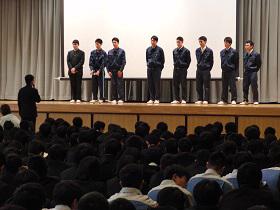 選手が登壇し、各団体の代表生徒が選手紹介と抱負を述べた後、生徒会長と校長先生から次のような激励の言葉を頂きました。