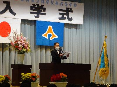 『満開の桜が咲き誇り、春爛漫のこの良き日に、全日制PTA会長・小野重光様、定時制PTA会長・平松幹枝様、学校後援会会長・杉浦雄一郎様、同窓会長・竹中正巳様、学校評議員・小池澄男様をはじめ、役員の皆様のご臨席を賜り、静岡県立科学技術高等学校、令和四年度入学式を挙行できますこと、教職員を代表して厚く御礼申し上げます。