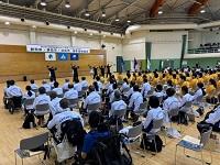 毎年、応援指導部が参加していますが、今回は生徒会役員による司会進行や吹奏楽部による演奏も加わって、今までにない取り組みで挑戦してみました。さらに、バドミントン部員も協力し、会場を盛り上げました。