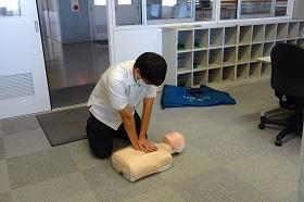 今回の講習は一般市民を対象とする「普通救命講習 1」で、胸部圧迫、人工呼吸、気道管異物除去、AED 使用方法、搬送法、エピペンの使用方法等について、一部実技も含め3時間の講習を受けました。