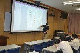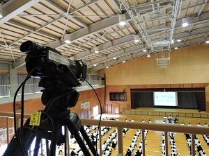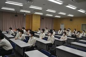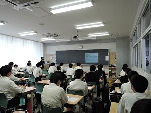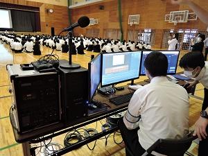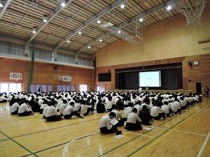 1・2年生は教室で体育館で行われている講座のライブ配信を視聴し、3年生は体育館に集まり対面での実施でした。