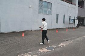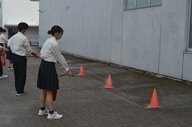座学終了後、中庭にて「水消火器」使ってコーン目掛けて実際に発射しました。水の勢いに手を取られてしまう生徒もいましたが、目標物をめがけてきちんと落ち着いて発射し、消火訓練が出来ました。