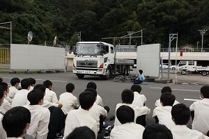 生徒たちは教官たちの説明に熱心に耳を傾け、内輪差・外輪差による巻き込み事故の怖さや自動車からの死角となる部分の確認等を行いました。