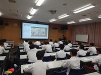 講師は、株式会社ファインテックで勤務している小林さん(令和3年度、機械工学科卒)で、 担当する加工技術の紹介や製造している商品などの紹介とともに、進路決定に向けての取り組みや、今後に向けての心構えなどを話してくれました。先輩の言葉を受け、後輩たちは自分の進路にむけて真剣に耳を傾けていました。