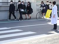 職員が学校周辺の通学路に立ち、あいさつを交わしながら交通安全を呼びかけています。