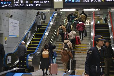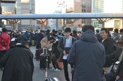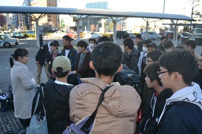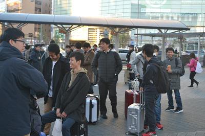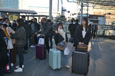 機械工学科が東静岡駅から静岡空港へ出発した直後、静岡駅では電気工学科・情報システム科・理数科(理工科)・都市基盤工学科が7:55発の新幹線に乗るために駅前に集まっていました。小倉駅または博多駅に向かいます。