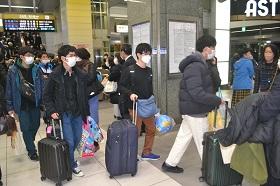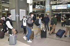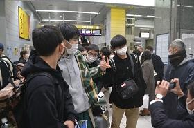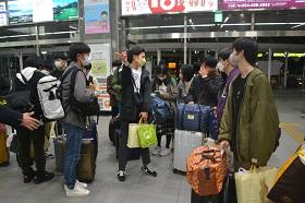 続いて19:37静岡駅着の新幹線「ひかり」で、新神戸駅・新大阪駅・京都駅から乗車した都市基盤工学科・理工科・電子物質工学科・情報システム科・機械工学科が帰ってきました。お土産をいっぱい抱えて、満足感と安堵感の表情で降り立ってきました。