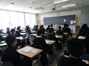 12月16日(金)LHRの時間、高等学校における主権者教育として、2年生を対象に選挙に関する出前授業が行われました。講師は静岡市葵区選挙管理委員会事務局の職員の方にお願いしました。世代別の投票率など選挙の現状についてや、自身が選挙活動をする際に注意することなど、パワーポイントを用いて説明していただきました。