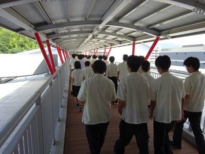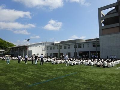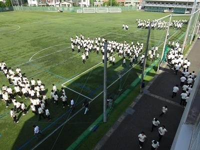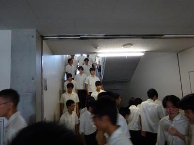 教室棟1階の食堂から火災が発生したと想定し、放送の指示によりグランドへの確実な避難を目指しました。