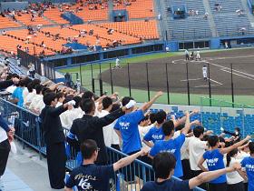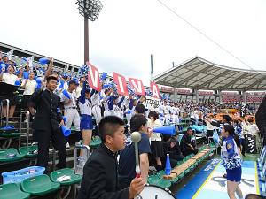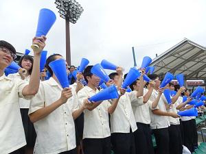 応援は、全員参加の1年生を中心に、2・3年生の有志、教職員、同窓会、野球部父母会等多くの方々がスタンドに駆け付け、梅雨空で試合開始から終了まで小雨が降り続くあいにくの天気でしたが、熱い応援にて本校野球部を後押ししました。