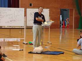 研修では、心臓の構造・心疾患の原因や症状に対する知識・AEDの機能や操作法、AEDと合わせて行う胸骨圧迫の重要性について説明を受けた後、参加者全員が胸骨圧迫からAEDの操作を疑似体験しました。また練習用エピペンを使って注射の練習を行いました。そのほかに気道に異物が入ったとき除去する方法として、背部こうだ法等についても指導いただきました。