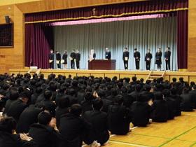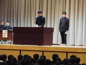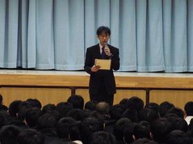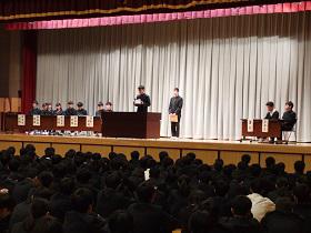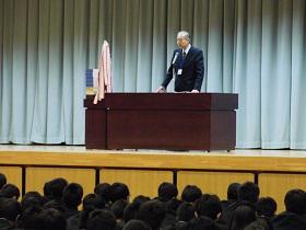 「2学期の終業式の本日は、1年間を締めくくる節目の日。節目は1年間を振り返り、次につなげる機会である。1年間を振り返り、どんなことを頑張ったかその成果を確認し、それに満足せずに次につなげる『NEXT ONE』を考える冬休みとしてほしい。来年新たな目標を胸に、目を輝かしてこの場に集うことを期待しています。」