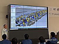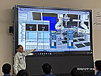 作業の安全に関する注意事項を聞き、バーチャルロボットセンターで説明を受けました。このロボットセンターは、工場のロボットの動作やラインの配置など大型の画面で事前に確認をすることができ、システム作りにとても活躍が期待されるものです。説明後、実機による実技指導を受け、ロボットにティーチングし操作を行いました。
