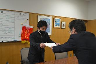 表彰式は11月21日(土)午後、本校校長室で行われ、まずは小川PTA会長から推薦書が